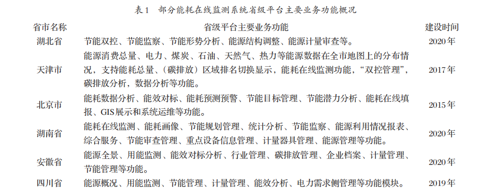 部分能耗在线监测系统省级平台主要业务功能概况如表1所示。