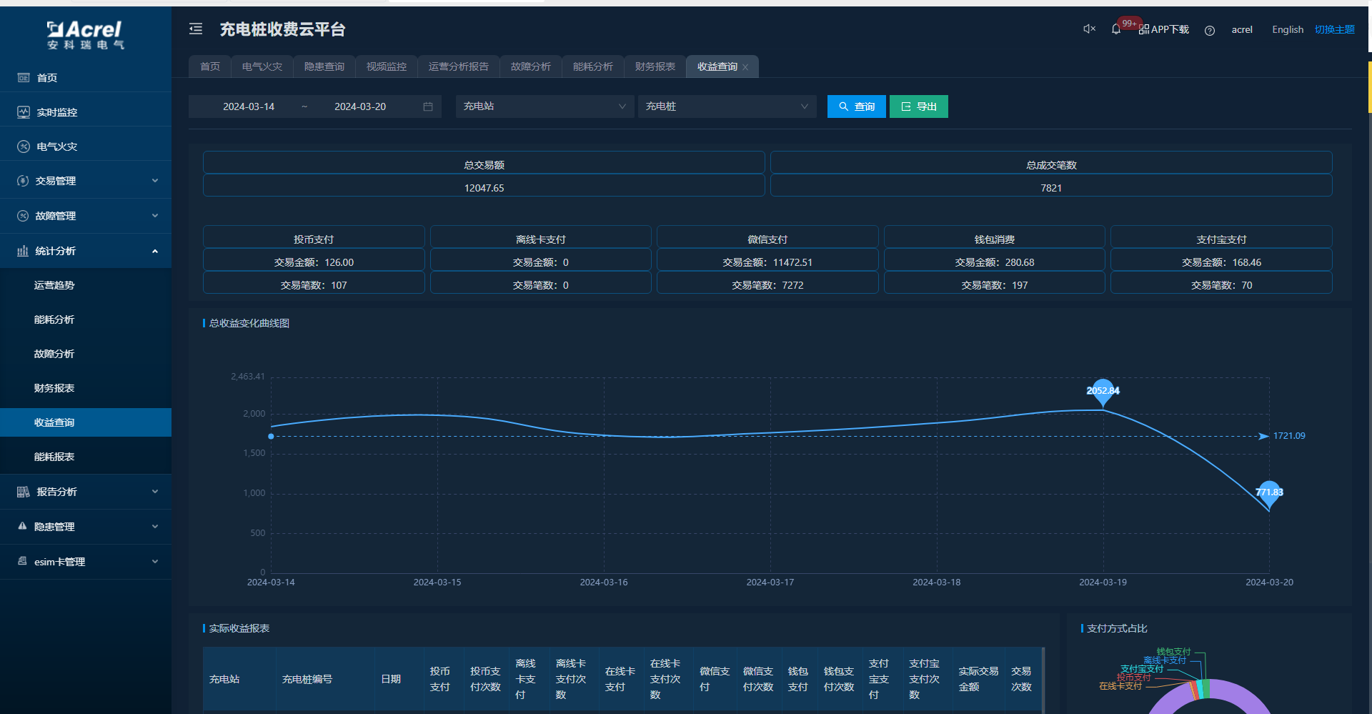 在收益查询中,可查看总的收益统计、收益变化曲线图、支付占比饼图以及实际收益报表。如图所示: