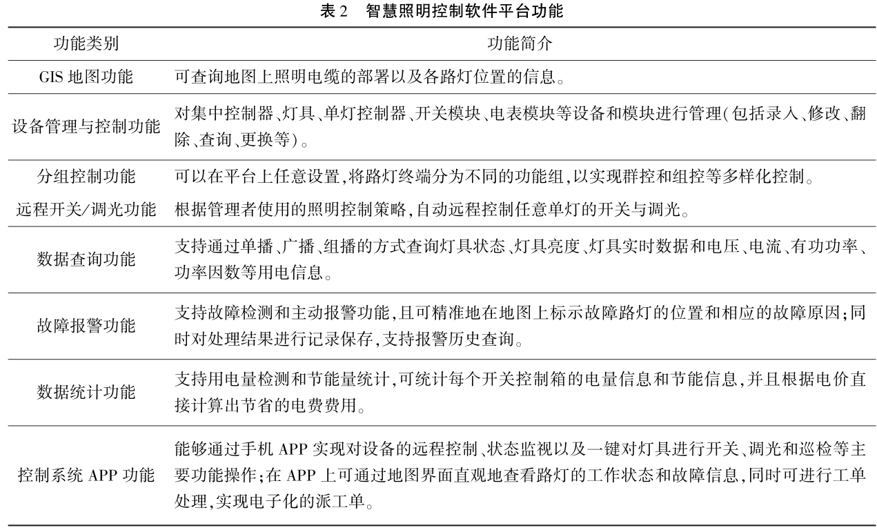 智慧照明控制软件平台具有GIS地图功能、设备管理与控制功能、分组控制功能、远程开关功能、分组控制功能等,见表2。