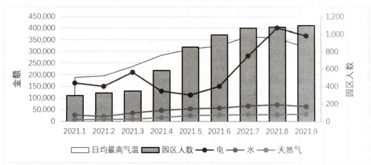 天然气能耗整体消耗比较平稳。因其使用集中在食堂区域,功能性定时定点提供工作日三餐及加班餐,节假日仅提供园区内执勤物业人员及加班员工餐饮,三季度能耗与园区入驻人数呈正相关,随园区人员的波动,燃气费趋势由前期的增长到后期逐渐平稳。因四季度无新部门入驻计划,预计该季度能耗费与上一季度基本持平。