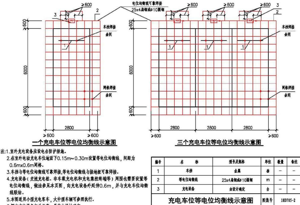 广东省标准要求,充电车位应有等电位联结措施。一般室内充电设置做防雷接地时,可在 附近柱位或墙体预留接地预埋件,与建筑物接地网连接, 图 3示意;室外充电桩接地可设置等 电位均衡线,做法详集1 8D70 5 -2 第47页,如图 4示意: