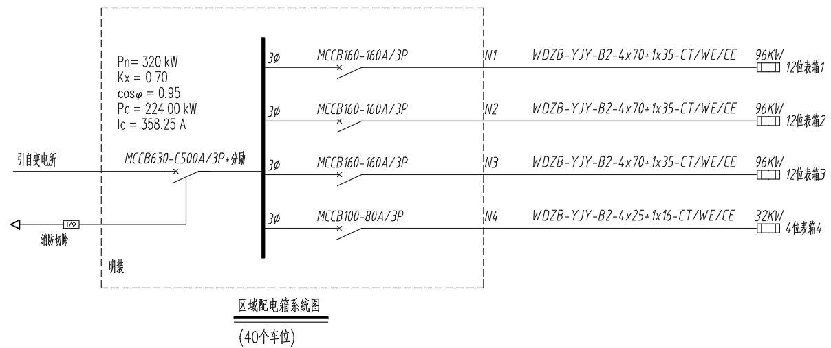 以某一防火分区40个充电车位为例,区域配电箱电源引自变电所低压柜,放射式供电,设 置4个充电桩电表箱,其中3个1 2位表箱,1个4 位表箱。 考虑到个别地区配电房内低压柜设置切非受限,故在区域配电箱设置消防切非。本区域配电箱接于同一相的充电桩数量40/3 = 1 3个,故Kx 取0 .7 ,Kt 取1 .0 ,则系统图如下图 1 :