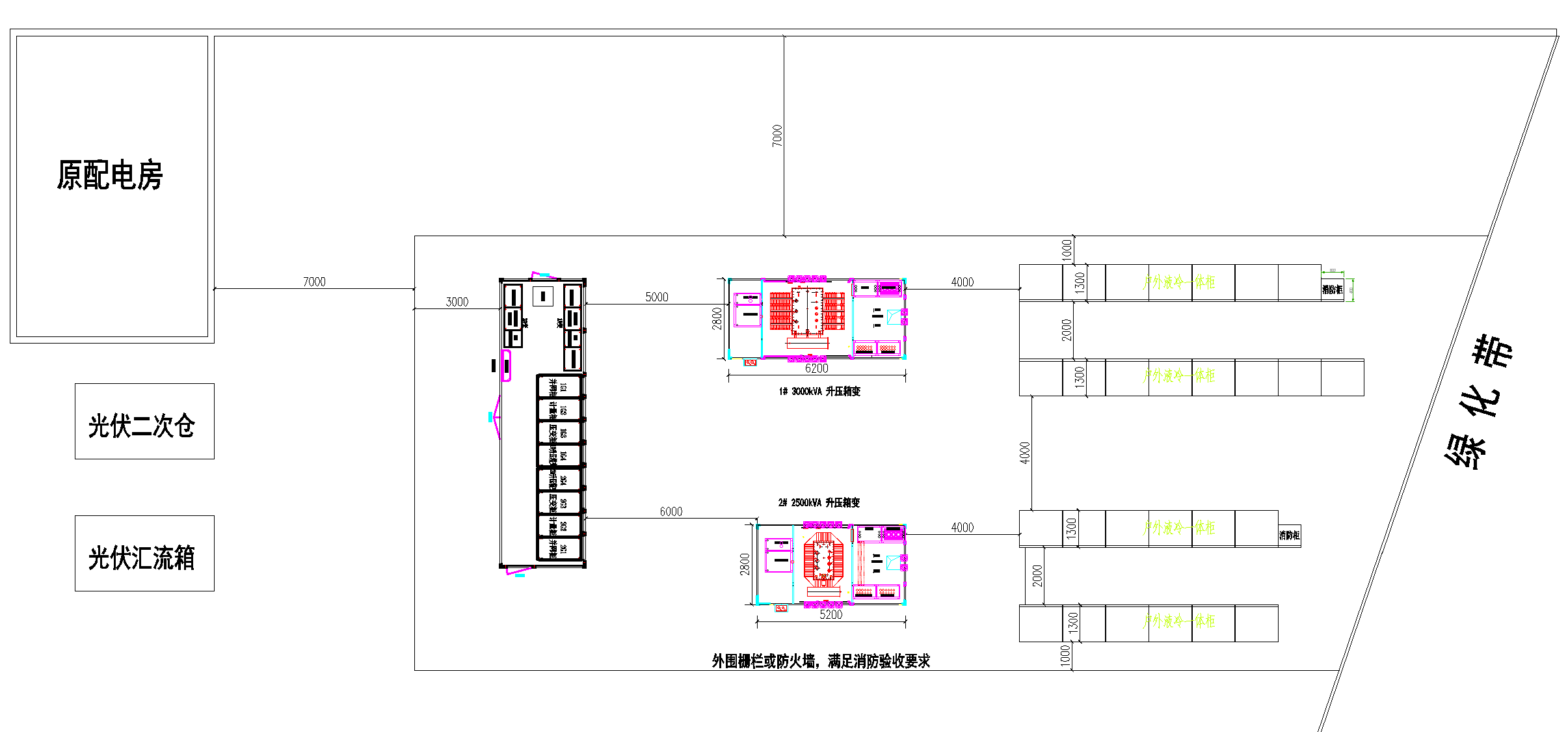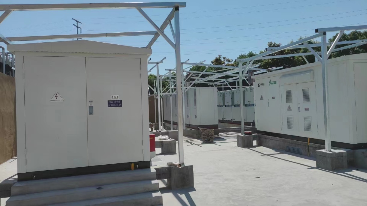 储能单元由储能一体柜、变压器、汇流站组成。本项目配置储能容量为186kW/372kWh的磷酸铁锂储能一体柜27台,3000kVA变压器1台,2500kVA变压器1台,并建设一座10kV开关舱。本次15套186kW/372kWh(即2790kW/5580kWh)的磷酸铁锂储能一体柜接入1台3000kVA升压变,12套186kW/372kWh(即2232kW/4464kWh)的磷酸铁锂储能一体柜接入1台2500kVA升压变,将直流电逆变为690V交流电,升压变高压侧以10kV电压等级接入2座10kV开关舱的进线柜。