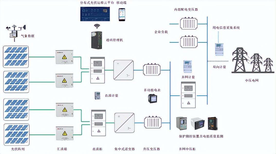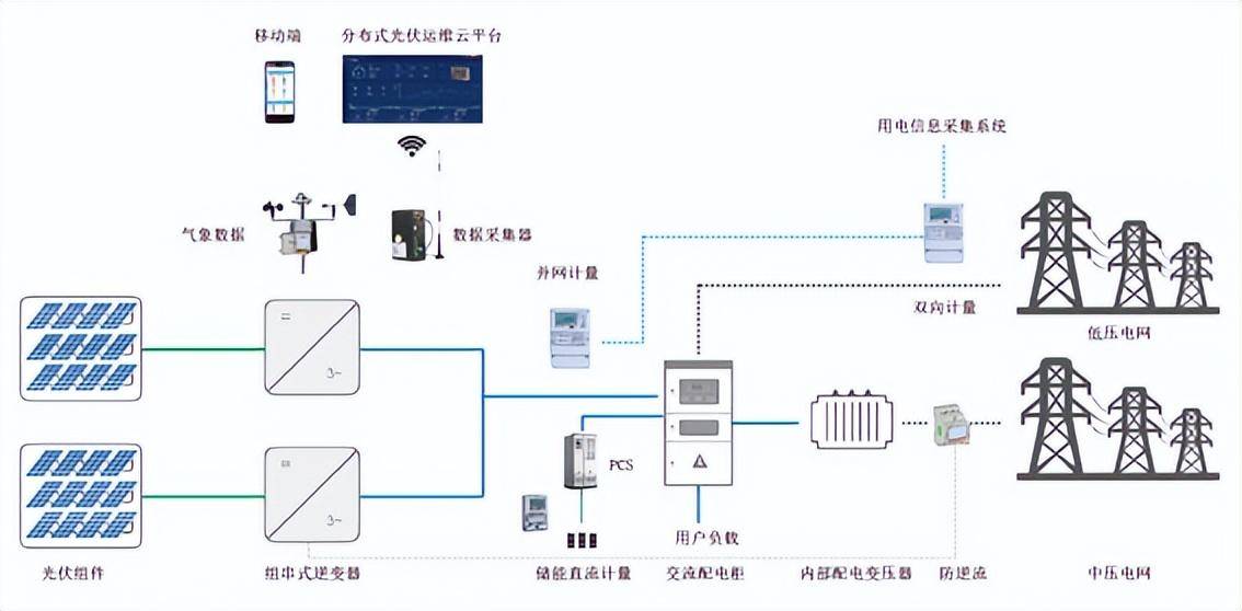 光伏阵列接入组串式光伏逆变器,或者通过汇流箱接入逆变器,然后接入企业380V电网,实现自发自用,余电上网。在380V并网点前需要安装计量电表用于计量光伏发电量,同时在企业电网和公共电网连接处也需要安装双向计量电表,用于计量企业上网电量,数据均应上传供电部门用电信息采集系统,用于光伏发电补贴和上网电量结算。
