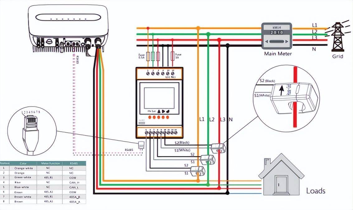部分光伏电站并网点需要监测并网点电能质量,包括电源频率、电源电压的大小、电压不平衡、电压骤升/骤降/中断、快速电压变化、谐波/间谐波THD、闪变等,需要安装单独的电能质量监测装置。部分光伏电站为自发自用,余电不上网模式,这种类型的光伏电站需要安装防逆流保护装置,避免往电网输送电能,系统图如下。
