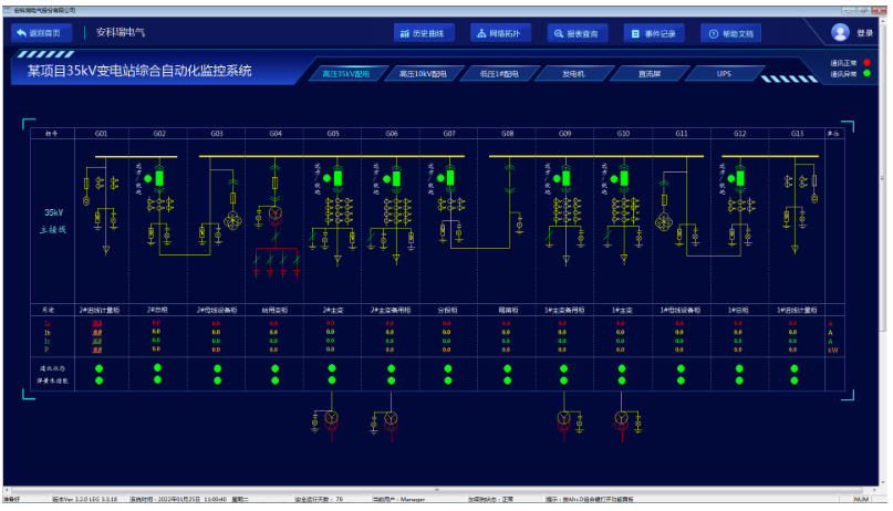 Acrel-1000变电站综合自动化系统,以配电一次图的形式直观显示配电线路的运行状态,实时监测各回路电压、电流、功率、功率因数等电参数信息,动态监视各配电回路断路器、隔离开关、地刀等合、分闸状态及有关故障、告警等信号。