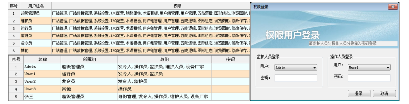 系统设置了用户权限管理功能,通过用户权限管理能够防止未经授权的操作系统可以定义不同操作权限的权限组(如管理员、维护员、值班员组等),在每个权限组里添加用户名和密码,为系统运行、维护、管理提供可靠的保障。