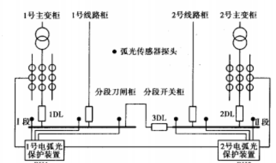 两套保护装置分别安装于1号及2号主变35kV开关柜内,电弧光传感器安装在各开关柜母线室内,以确保母线室内发生任何弧光故障时都能感受弧光,发出动作信号。