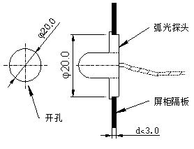 ARB-S弧光探头固定在卡扣支架上,卡扣支架需要开孔安装。卡扣支架的开孔尺寸为20mm(直径)。