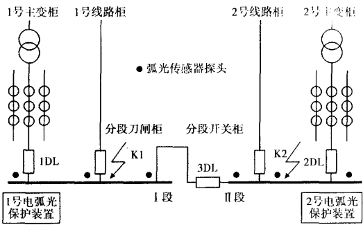 1DI3DI合位,2DI分位,由1号变带I、Ⅱ段母线。如故障发生在K2处,l号保护装置BH1收到2号保护装置BH2发来的Ⅱ段弧光动作信号,同时本侧过流起动,保护跳3DI切除故障。BH2由于本侧电流不起动,保护不动作。动作结果是切除Ⅱ段母线,l段正常供电。如故障发生在K1处,l号保护装置BH1收到本侧发的I段弧光动作信号,同时本侧过流起动,保护跳1DI切除故障。BH2由于本侧电流不起动,保护不动作。动作结果是切除I、JI段母线。