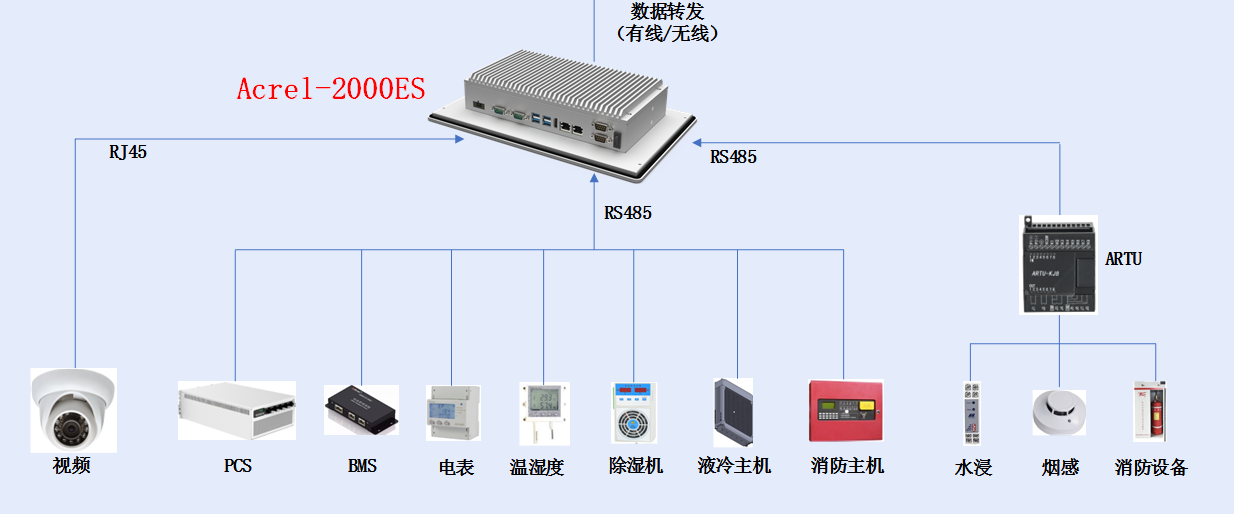 Acrel-2000ES,可通过直采或者通过通讯管理或串口服务器将储能柜或者储能集装箱内部的设备接入系统。系统结构如下: