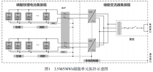 储能电站容量采用5MW/10MWh,根据目前PCS设备技术发展水平,采用两套2.5MW/5MWh功率单元并联组合成5MW/10MW.h,功率单元升压后并联接入油气田电网,储能单元拓扑示意图如图1所示。采用功率单元并联也有利于未来随着油田电网的发展,装机容量提高,系统热备容量要求提高后,通过进一步并联功率单元,实现储能电站的扩容。
