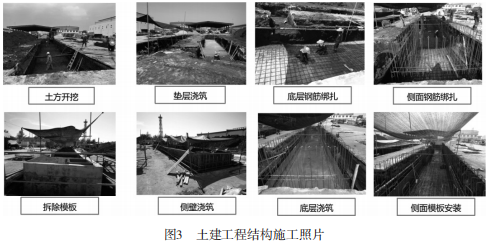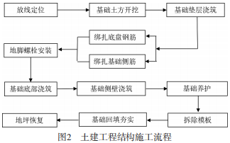 罩棚基础、储能电池集装箱基础、储能变流升压一体机基础单位面积荷载较小拟采用浅基础,基础埋深2m,基础高出现有地坪面200mm,持力层为棕褐粉质黏土,承载力特征值按190kPa考虑。集装箱基础采用C30混凝土,HRB400级钢筋现浇;素混凝土设备基础采用C40混凝土现浇;设备基础外露部分抹20mm厚水泥砂浆面层;垫层采用100mm厚C15混凝土;土建工程结构施工流程图如图2所示,现场施工图片如图3所示。