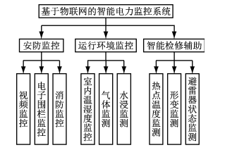 分析电网智能监控中所需要的实际场景,并结合物联网技术能够为电网所能提供的便利,将系统中与物联网技术结合为紧密的功能进行分解,本文分析认为研究的重心主要分为3个主要部分:安防监控、运行环境监测和智能辅修,如图1所示。