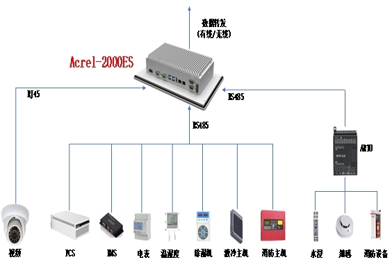 | 功能:转换“辅助系统"的状态数据,反馈到能量管理系统中。1)空调的开关,调温,及W全断电(二次开关实现);2)上传配电柜各个空开信号;3)上传UPS内部电量信息等;4)接入电表、BSMU等设备 |