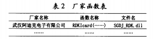 根据系统自动识别的要求,系统在自动识别卡类型的基础自动识别厂家,分别调用各自厂家的函数,因此规定各自的厂家代码及函数名称。厂家函数设置见表2。