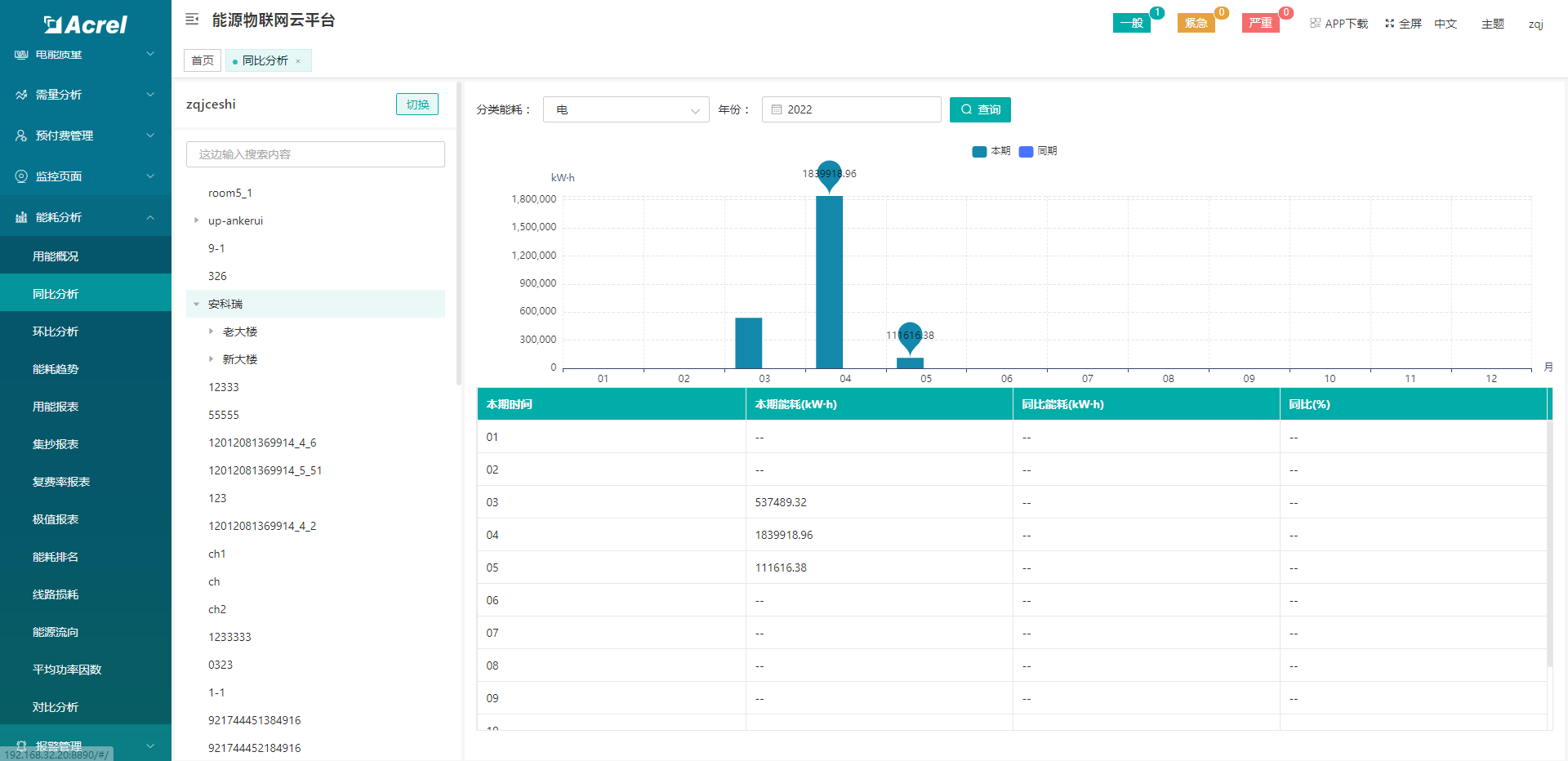 系统还提供了多个报表以供查询。用电综合报表,帮助财务统计每个月商铺总用电量,尖峰平谷用电量以及电费,能耗同比分析,可以比较每个月份与去年同期相比的用能差距。能耗日月年报表,按日,月,年三个不同维度查询电表每个阶段的用能情况。