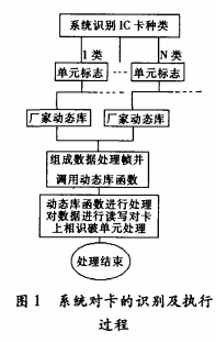系统运行时,首先通过自动检测系统检测出IC卡的类型,再根据IC卡的类型,通过IC卡上特定的标志单元内容(厂家代码)识别出该IC卡的厂家,识别完成后,系统调用特定厂家的动态链接库,而动态链接库的调用格式是一致的,各个厂家按照规范自行编制对IC卡操作的函数库。图1示出了系统识别卡并调用厂家动态连接库的过程。