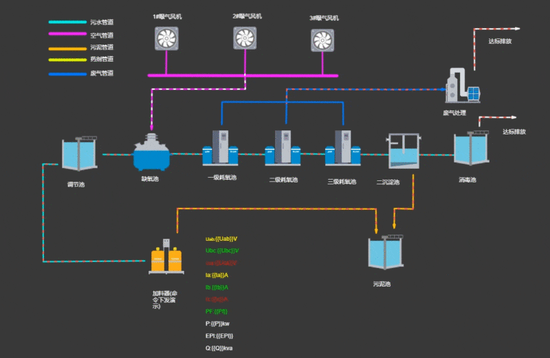 能流图:需要在能流图上对水、电、气的消耗情况进行实时展示;当能源参数越限报警,可提供报警重要性等级分类,同时支持APP推送、手机短信、邮件、钉钉、语音播报、系统弹窗报警提示等;