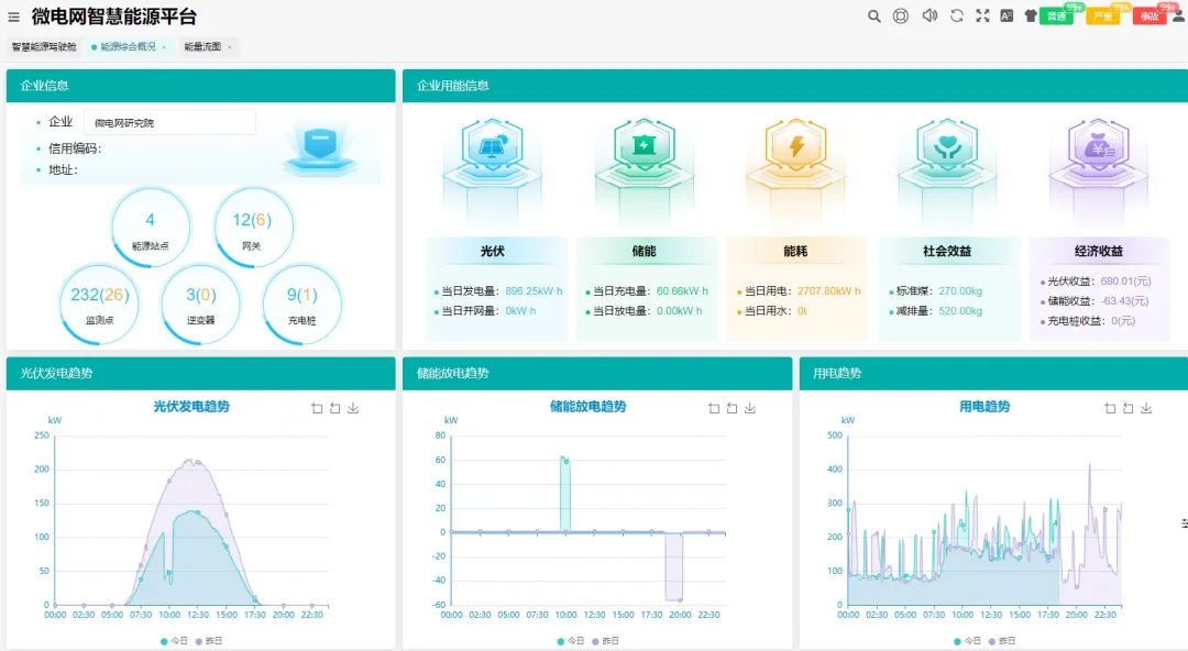 对微电网的源、网、荷、储能系统、充电负荷进行实时监控、诊断告警、全景分析、有序管理和高级控制,满足微电网运行监视全面化、安全分析智能化、调整控制前瞻化、全景分析动态化的需求,完成不同目标下光储充资源之间的灵活互动与经济优化运行,实现能源效益、经济效益和环境效益zui大化。