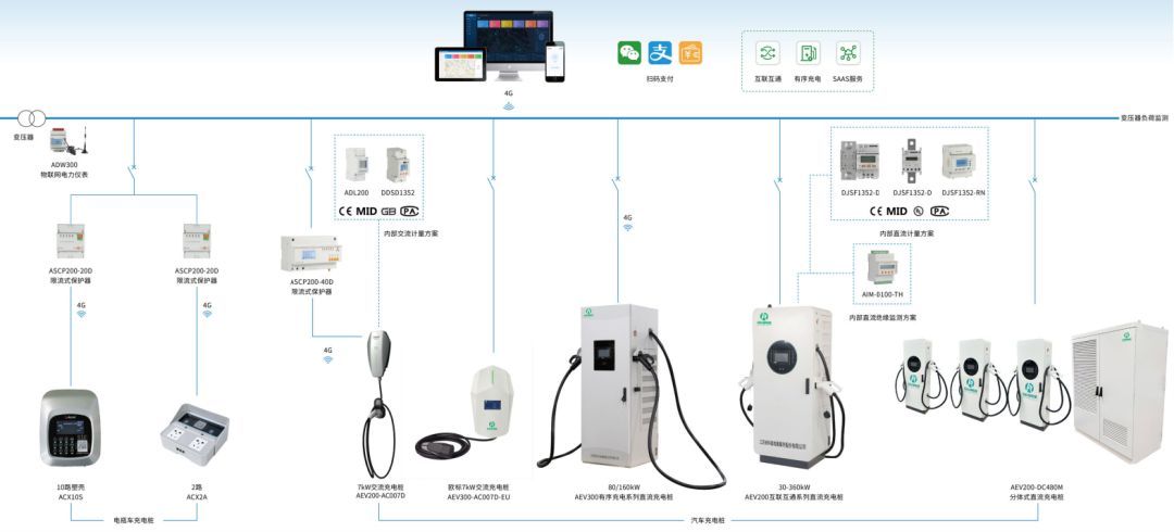 充电桩系统: 提供交流慢充和直流快充两种充电方式,满足不同类型电动汽车的充电需求,并支持预约充电、扫码支付等便捷功能。