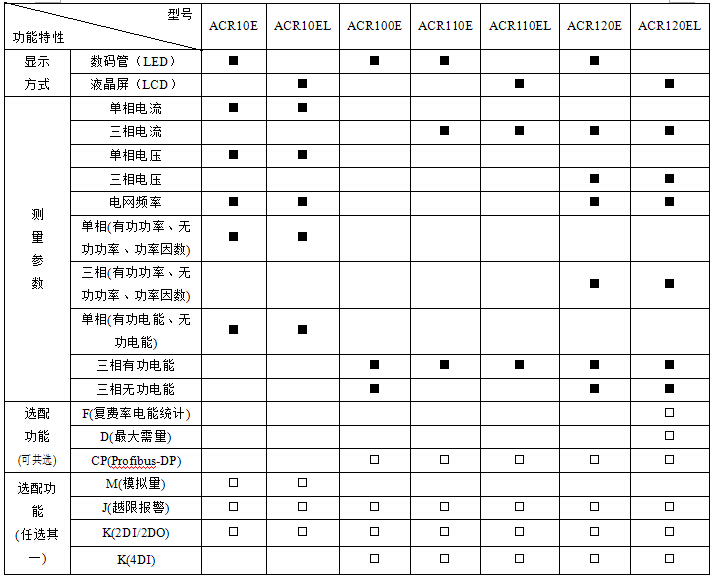 2、ACR230ELH的J(继电器越限报警输出)功能与第一路开关量输出复用,其他型号J功能的数量与开关量输出数量一致;