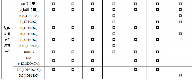 1、“■"为标配功能,“□"为选配功能,以上仪表标配1路RS485通讯;