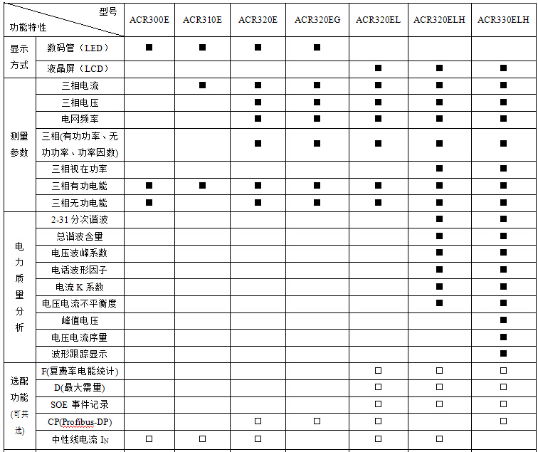 3、ACR300E、ACR310E、 ACR320E(L)、ACR320ELH在选配K(8DI/4DO)功能时无脉冲信号输出端口,选配K(4DI/4DO)功能时具备1路有功电能脉冲信号输出端口;