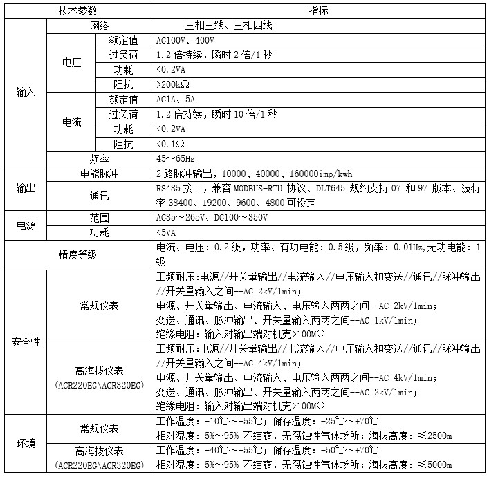 三相四线数显多功能网络仪表RS485通讯产品技术参数: