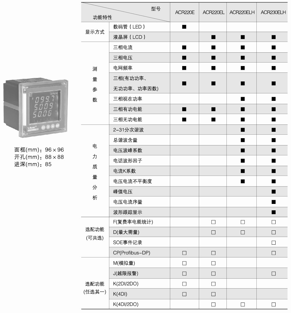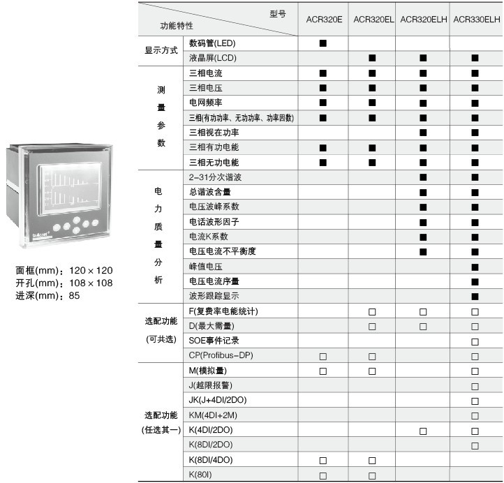 1.ACR320E(L)在选配K(4DI/4DO、8DI/4DO)功能时无脉冲信号输出端口;