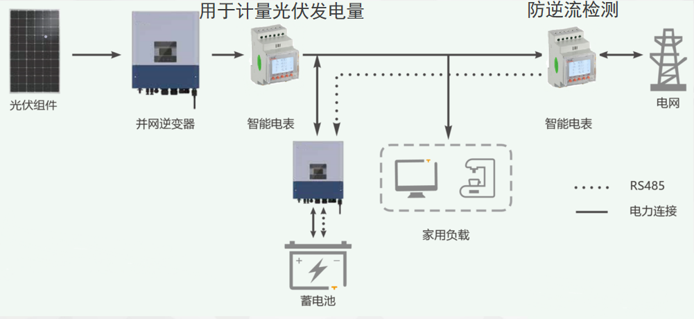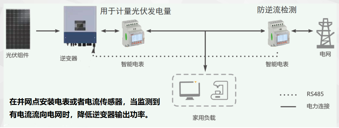 光伏逆变器在将光伏组件产生的直流电逆变成交流电时,会夹杂有少量直流分量和谐波,同时,光伏电通过配电变压器向大电网送电存在不可调度的情况。所以,目前部分电力部门只允许光伏系统并入市电电网,但不允许剩余电力通过配电变压器向大电网馈电。防逆流方案正是为了解决这类问题而产生的。
