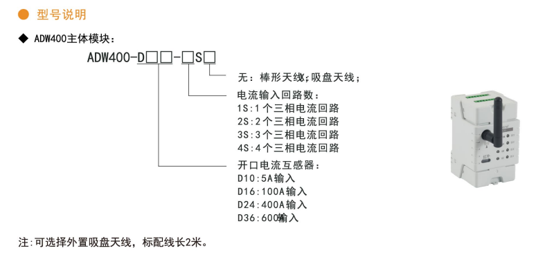 ADW400环保用电监管 多功能物联网仪表主要用于计量低压网络的三相有功电能,同时可选择四个回路的电流输入,具有RS485通讯和470MHz无线通讯功能,方便用户进行用电监测、集抄和管理。可灵活安装于配电箱内,实现对不同区域和不同负荷的分项电能计量,统计和分析。