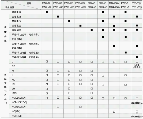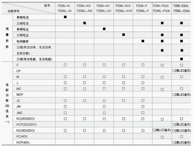2、PZ96(L)-E3(4)在选配KC(4DI)功能时具备1路有功电能脉冲信号输出端口,在选配KC(2DI/2DO、4DI/2DO)功能时无脉冲信号输出端口;