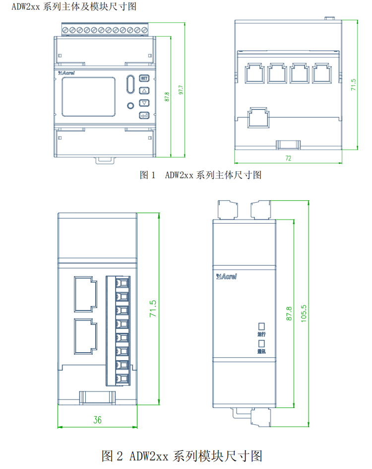 ADW2xx系列导轨式多回路电力仪表主要用于低压三相回路全电参量测量,同时可选择四个回路的电流输入。可直接或间接测量电压、电流、功率、功率因数、相角、不平衡度、谐波等参数。 还可通过其RJ45接口扩展辅助功能,实现DI、DO、测温、剩余电流测量,以及2G、4G、LoRa、LoRaWan、NB-Lot无线通信功能。