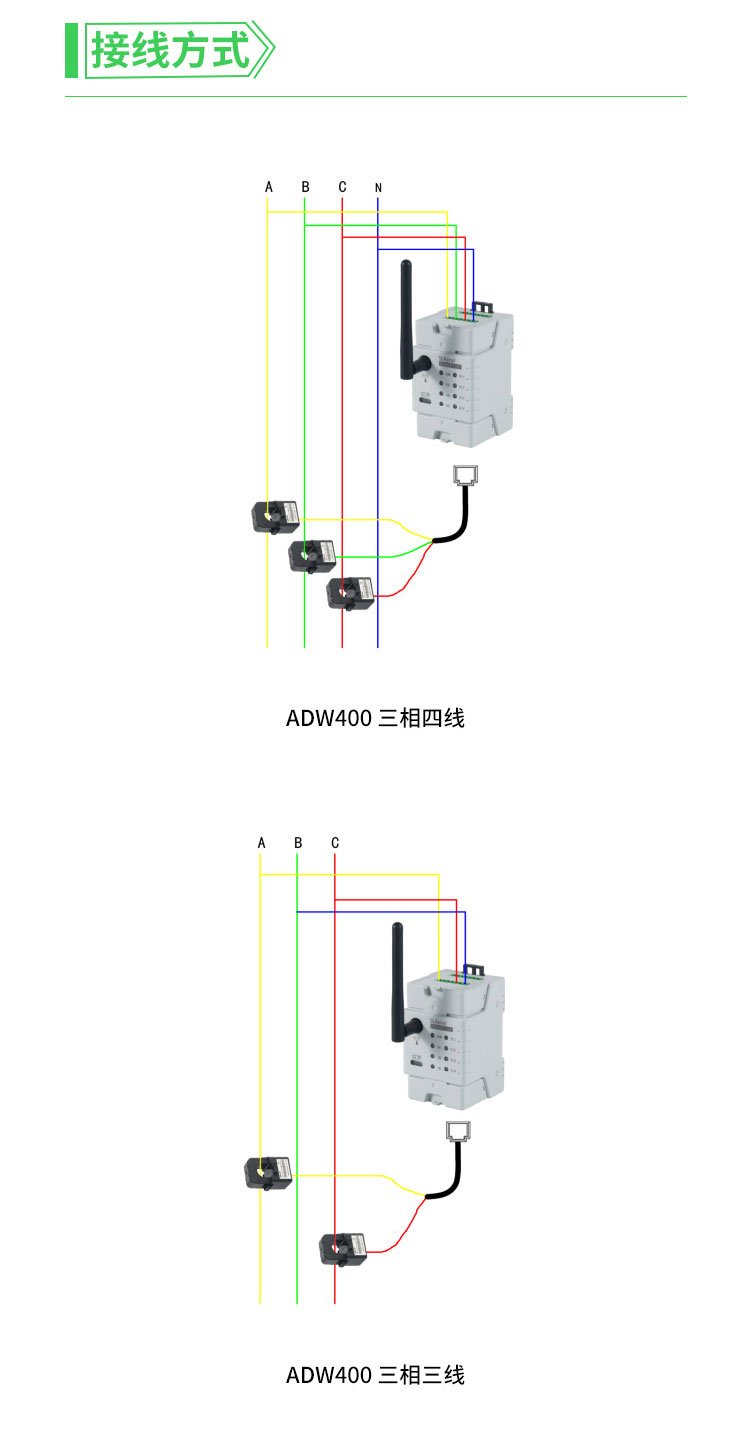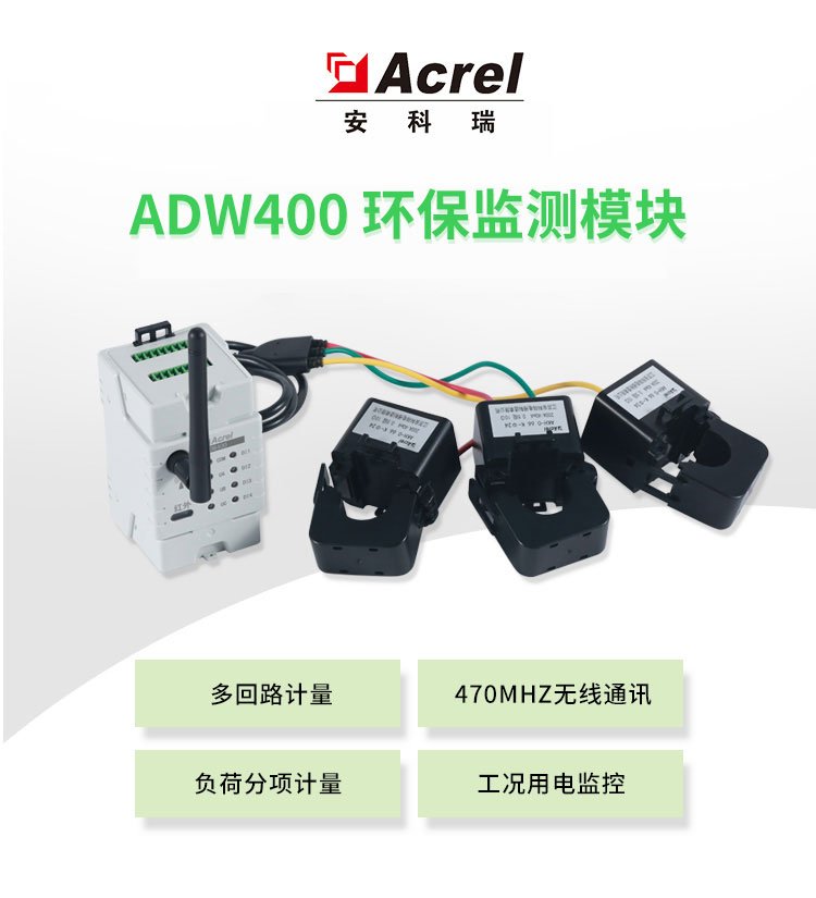 ADW400 环保监测模块主要用于计量低压网络的三相有功电能,同时可选择最大四个回路的电流输入,具有