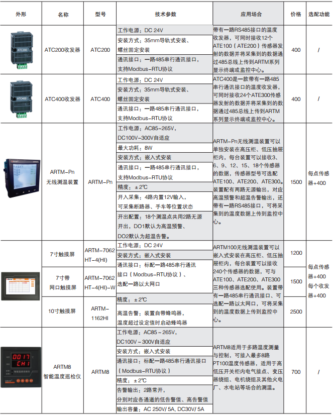 ARTM-Pn无线测温装置:ARTM-Pn无线测温装置可以单独安装在高压柜、低压抽屉柜内,每台装置可以接收18个传感器的数据,传感器型号可选配ATE100、ATE200、ATE300。装置带有一路485接口,可将采集到的温度数据上传到监控中心。