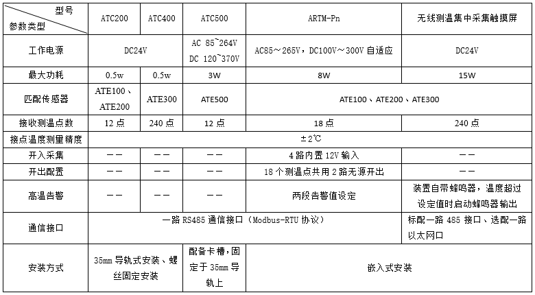 ARTM-Pn无线测温装置:ARTM-Pn无线测温装置可以单独安装在高压柜、低压抽屉柜内,每台装置可以接收18个传感器的数据,传感器型号可选配ATE100、ATE200、ATE300。装置带有一路485接口,可将采集到的温度数据上传到监控中心。