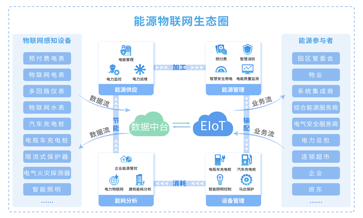 感知层:连接于网络中的各类传感器,包括多功能仪表、预付费电表、多回路仪表、物联网电表、物联网水表、电瓶车充电桩、汽车充电桩、路灯控制器等。网络层:智能网关,采集感知层的数据,进行规约转换及存储之后将数据上传至能源物联网云平台。平台层:包含应用服务器和数据服务器,可在PC端或移动端实现应用。