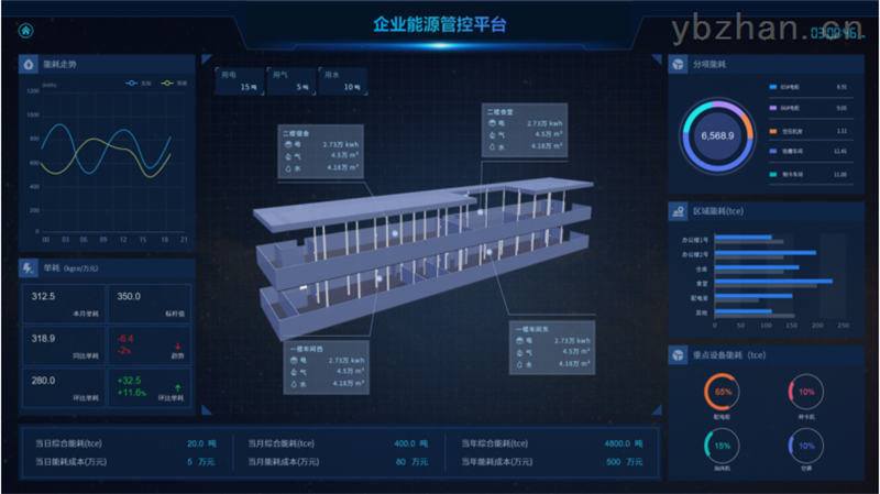 展示企业各类能耗总量、折标值、能源成本、能源消耗趋势、分项能耗占比、区域能源消耗对比,以及当天气情况、污染情况,并三维展示企业重要工艺或工段的能源消耗动态。