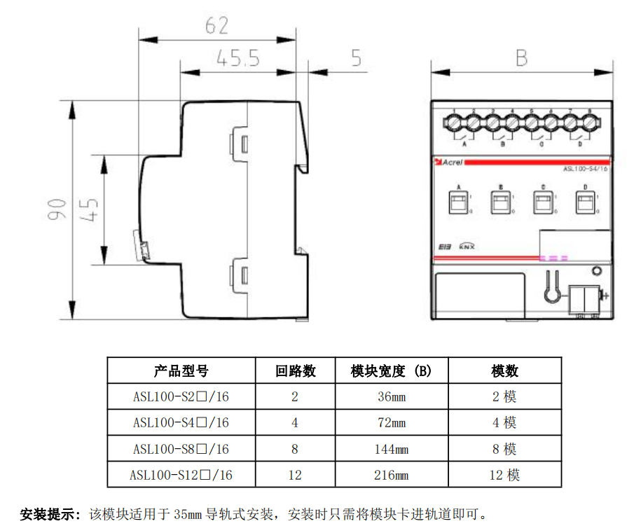 ASL100-Sx/16 系列开关驱动器作为执行单元,其作用是对各强电回路进行开关控制该驱动器每路继电器 大负载电流为 16A,负载可以为容性、阻性或者感性。此模块可以和符合 KNX 标准的任意控制模块进行连接。 开关驱动器接收并且解析报文,然后执行相应的动作。ASL100-SxI/16 系列开关驱动器除以上功能外,同时具 备电流检测功能,可通过阈值设置判断回路是否故障。 ASL100-Sx/16 系列驱动器有多种功能可选,具体使用需要通过 ETS 软件进行设置。
