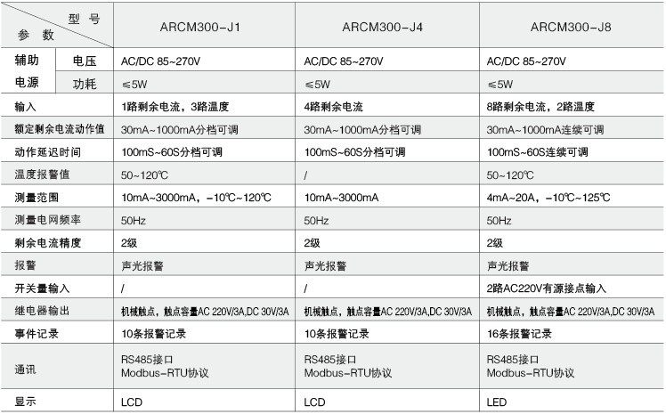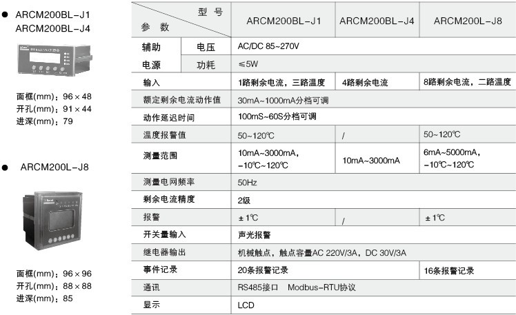 ● ARCM200L-J1、ARCM200L-J4具有事件存储功能,报警器能够记录报警发生的时间、类型、参数,根据报警记录可以分析现场的用电情况,为消除故障提供依据;