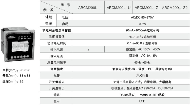 注 : ARCM200L-I: 三相电流监测,过流保护