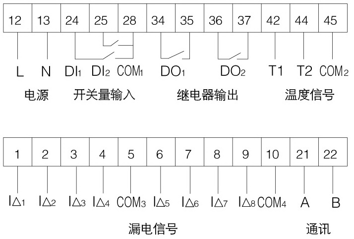 ● 实时监测一路剩余电流,一路温度。可选配三相电流,三相电压,频率,功率,四象限电能等电参量监测(具体见仪表选型);