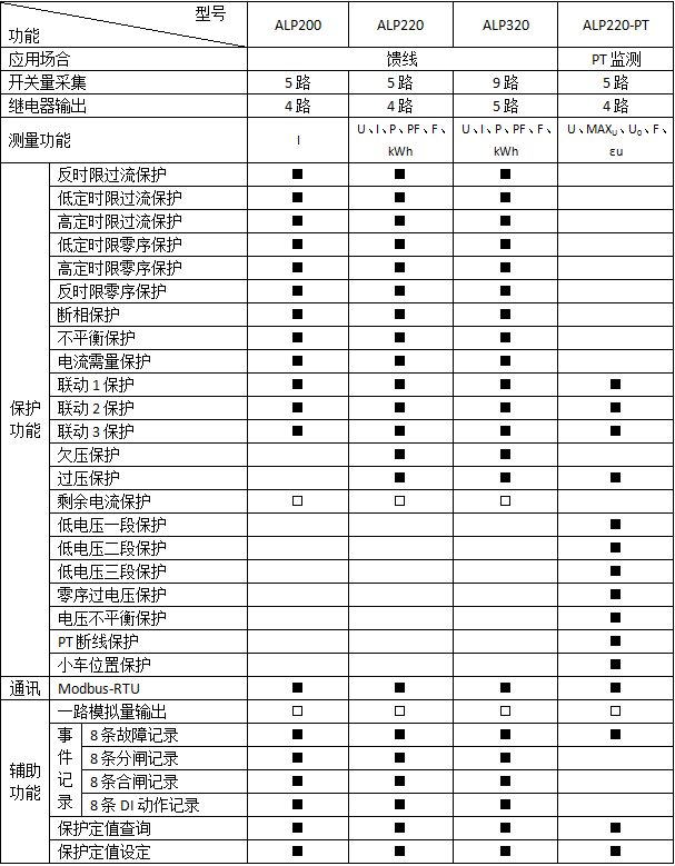 ALP 系列产品集保护、测量、控制、总线通讯为一体,同时提供了远程自动控制、现场直接控制、面板指示、信号报警、操作记录、跳闸报警记录及开关量记录等功能。适用于煤矿、石化、冶炼、电力、船舶、以及民用建筑等领域。