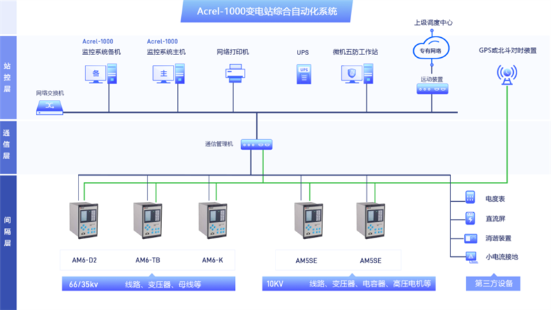 Acrel-1000变电站综合自动化监控系统在逻辑功能上由站控层、间隔层二层设备组成,并用分层、开放式网络系统实现连接。站控层设备包括监控主机,提供站内运行的人机联系界面,实现管理控制间隔层设备等功能,形成全站监控,并与远方监控、调度通信;间隔层由若干个二次子系统组成,在站控层及站控层网络失效的情况下,仍能独立完成间隔层设备的就地监控功能。