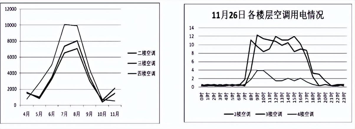 从图2可知,各层空调用电基本规律相同,7、8月份是空调用电的高峰期。3楼与2楼的空调用电基本相同,但考虑到2楼的计量面积较少,故2楼的单位面积空调用电较高。4楼空调用电夏季使用较多,符合其人数较多的现状,而进入11月份其空调用电较2、3楼低,可能与其工作人员中占多数的年轻人对低温适应能力较强而未开启空调有关,见图2。