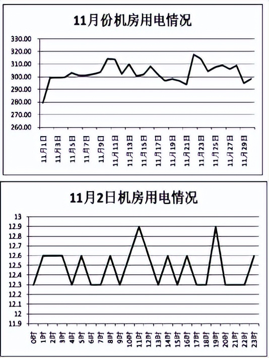 图3所示为机房用电情况趋势图,从图中可知机房用电比较规律,日用电在300kW·h左右,用电基本在12.5kW·h左右,起伏很小。这与机房内各类设备24h工作情况相符。机房内各类计算机网络设备工作状态下的能耗基本不变,空调的工作能耗与气温情况关系不大。
