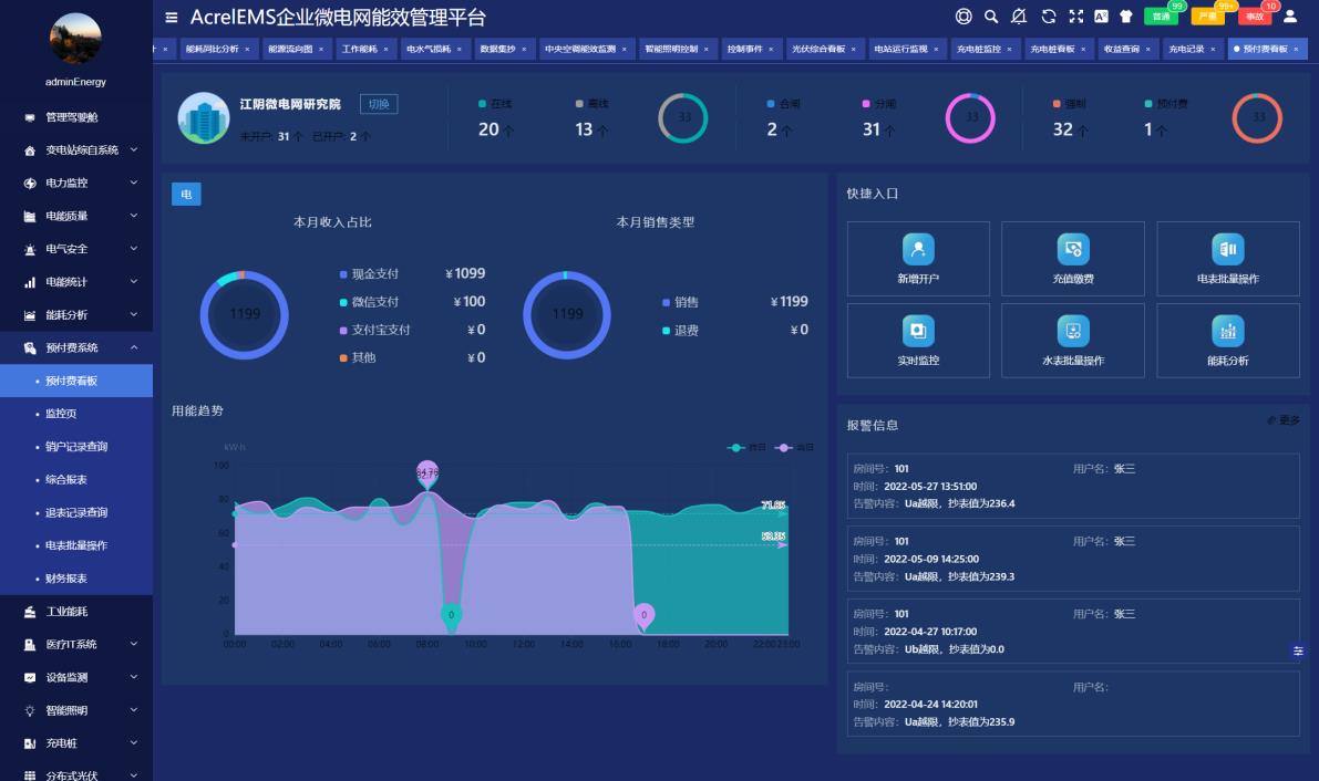 对厂区内职工宿舍进行负载管理,包括恶性负载识别管理、负载阈值管理,避免因为恶性负载引起火灾。对员工宿舍进行水电收费管理,支持微信、支付宝等缴费方式,采集职工宿舍能耗数据。