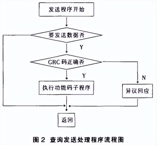 当消息从主站发往从站时,功能代码域将告之从站需要执行哪些行为。在这里主要使用到3种功能码,03H:读寄存器数据,05H:单个线圈输出,06H写寄存器数据。读寄存器的内容包括开关分合闸状态、当前电流值、电压值、故障记录值等。从站回应时,它使用功能代码域来指示是正常回应无误还是有某种错误发生称作异议回应。对正常回应,从站仅回应相应的功能代码。对异议回应,从站返回一等同于正常代码的代码,并将功能代码置为逻辑。功能码是单个线圈输出,它可以通过从站设备输出,控制对应断路器的分合。在程序中设置一个帧计时器,当线路上有数据时就刷新该计时器,线路空闲时则停止刷新,计时时间达到3.5帧时计时器被软件清除,而下一帧则为地址帧,MODBUS通信查询发送处理程序流程见图2。