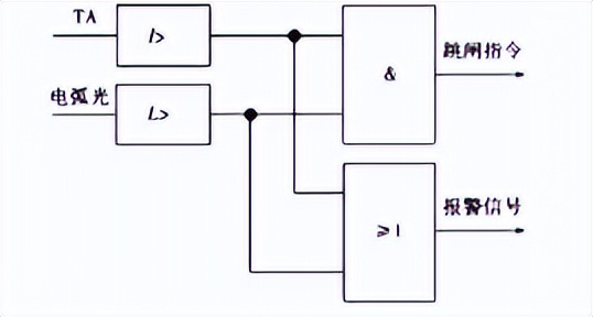 弧光保护的原理,如图1所示,它的动作判断据为故障时产生的两个条件,也就是弧光和电流增量。在发生故障时,它会检查开关柜,然后,在同时检测到弧光和电流增量时,就会下达跳闸的指令。